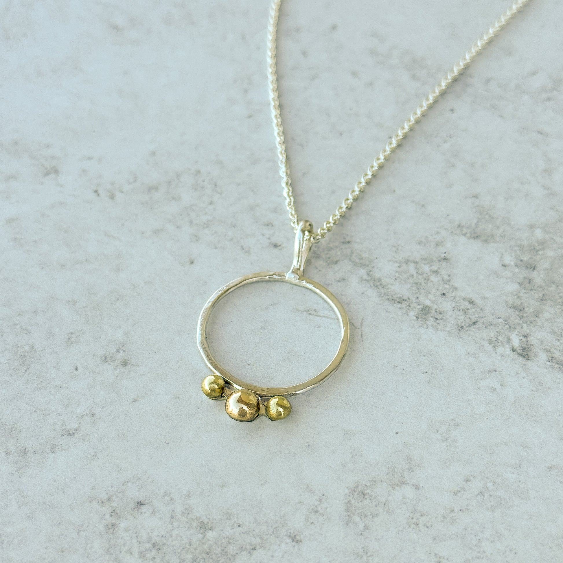 This handmade necklace features a round circle sterling silver pendant adorned with brass accents, set on a sterling silver chain.