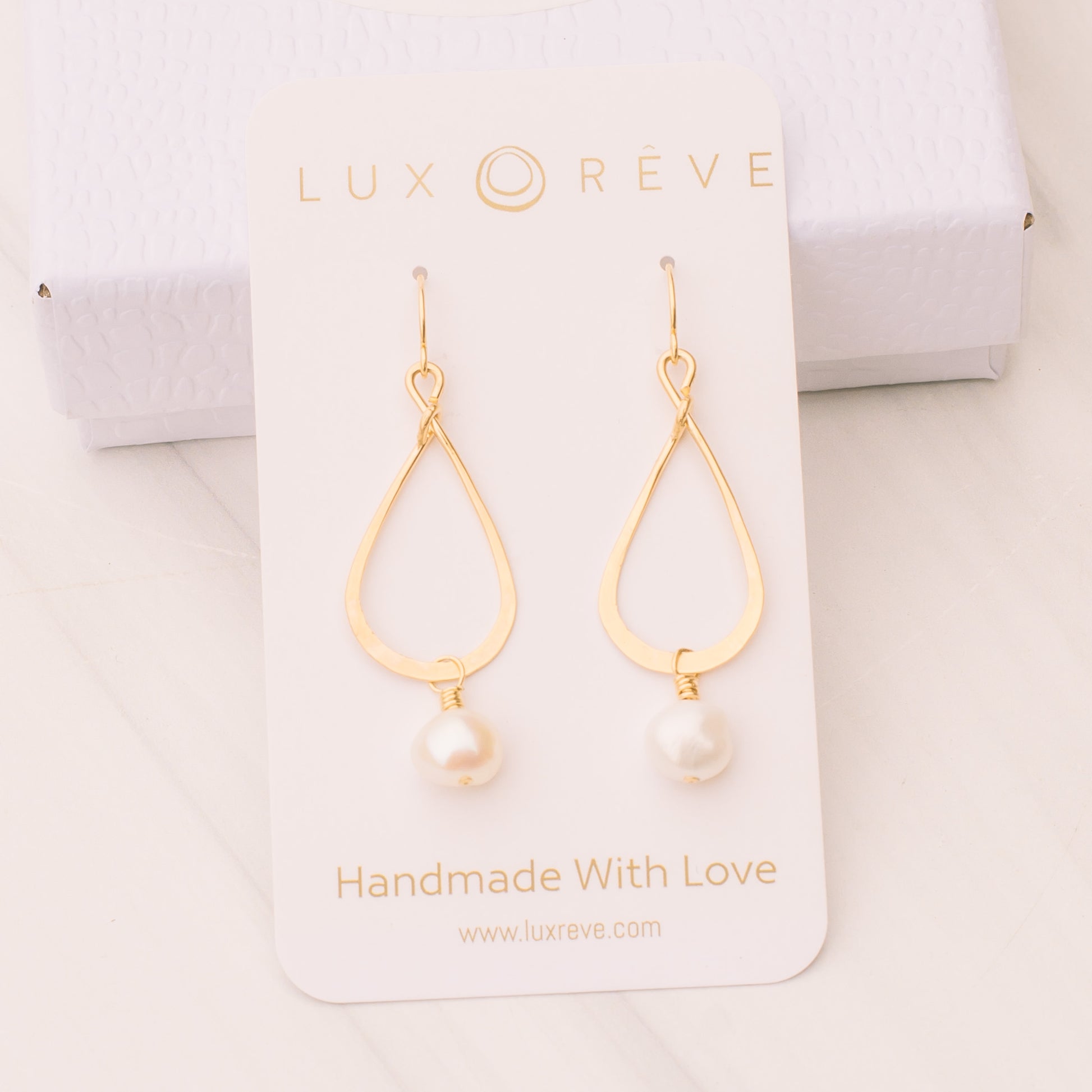 These hammered, hand-crafted gold-filled tear drop hoops blend timeless elegance with a fun flair. Featuring cultured freshwater pearls, they add a stylish shine that suits any ensemble. Perfect for dressing up at a wedding or keeping it casual with jeans.