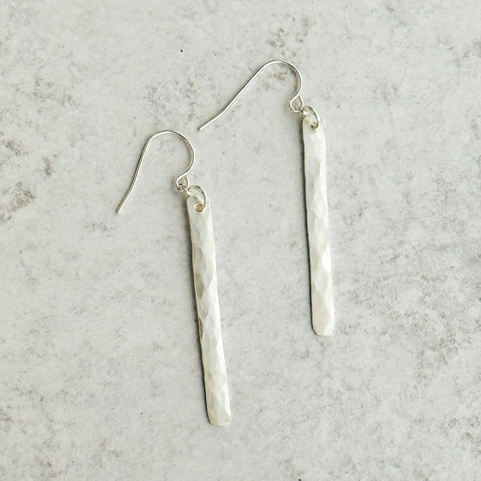Handcrafted sterling silver bars with a beautiful hammered finish. These versatile earrings are perfect for everyday wear—simple, elegant, and timeless. A go-to pair that works with any style.